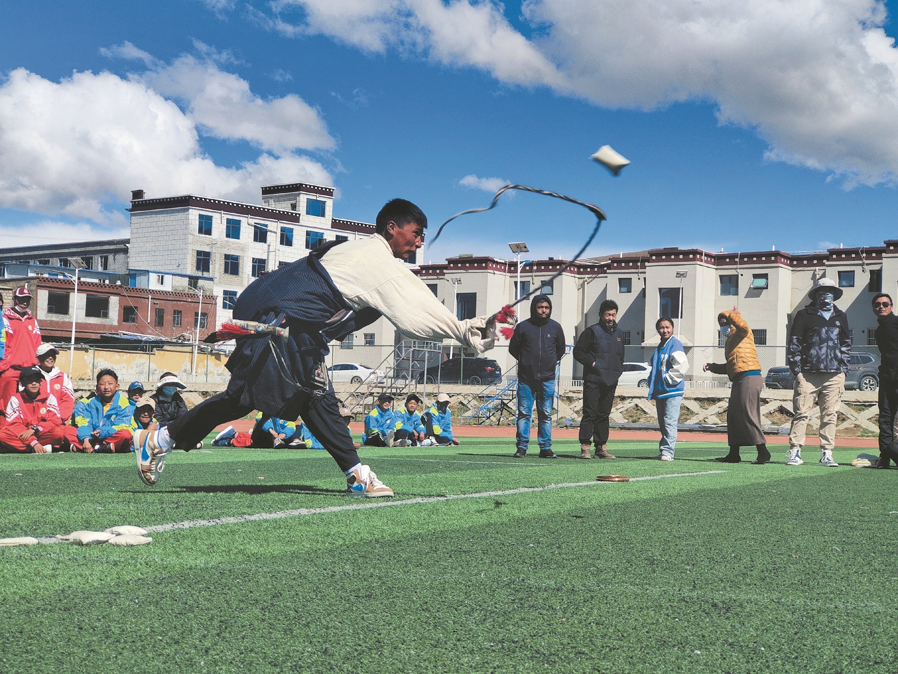 圖為當(dāng)雄縣中小學(xué)生在參加傳統(tǒng)競技項目“吾多”比賽。 拉薩融媒記者 白 央攝