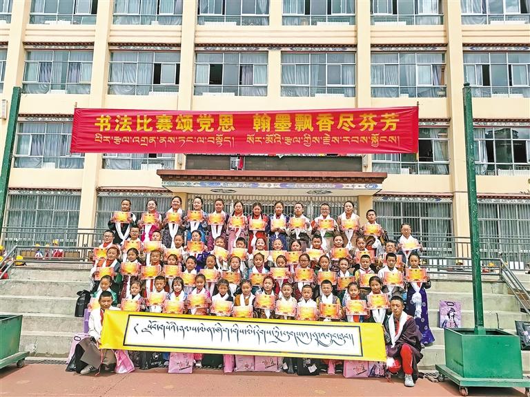 “我們學(xué)校組織過(guò)幾次書法比賽,還選取了一些較好的作品裝訂成書,發(fā)放到每個(gè)班級(jí)供學(xué)生們參考。這樣一來(lái),很多學(xué)生在書上看到別人的照片和書法作品時(shí),能夠激發(fā)他們對(duì)書法的興趣和書寫的積極性?,F(xiàn)在,參賽的學(xué)生越來(lái)越多了?!蹦餆嵝W(xué)副校長(zhǎng)拉巴介紹,在教育改革以及學(xué)校“雙減”工作和課后服務(wù)的背景下,娘熱小學(xué)積極探索,結(jié)合本校實(shí)際情況,開設(shè)了藏戲、藏文書法、校園足球等三大特色板塊。2019年,拉薩市文聯(lián)、曲藝家協(xié)會(huì)以及書法家協(xié)會(huì)分別授予娘熱小學(xué)曲藝、舞蹈、藝術(shù)教育培訓(xùn)基地和書法教育培訓(xùn)基地稱號(hào),極大提高了師生的學(xué)習(xí)積極性。