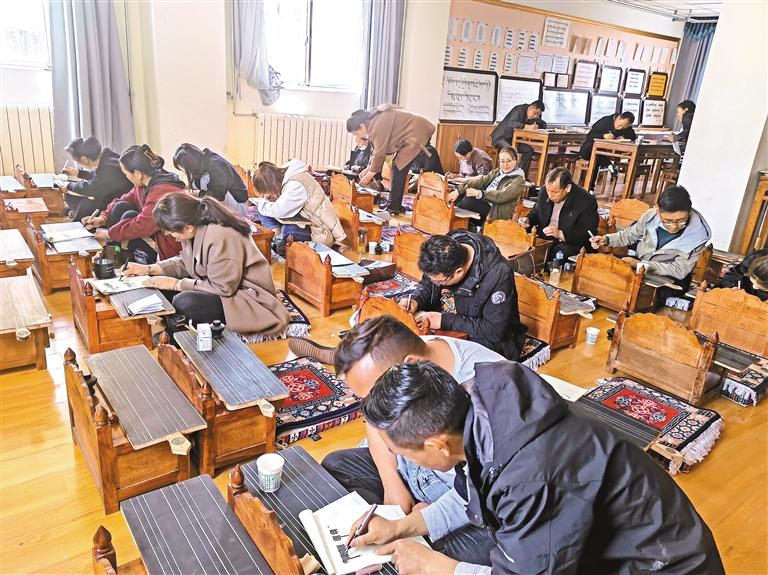 娘熱小學(xué)的書法室內(nèi),與藏戲課堂的熱鬧氛圍截然不同,剛剛?cè)腴T藏文書寫的一、二年級(jí)小朋友正握著筆,在“墻星”書寫板上安靜、認(rèn)真地書寫著藏文。來(lái)自拉薩市文聯(lián)書法家協(xié)會(huì)的藏文書法家指導(dǎo)著孩子們的握筆姿勢(shì)、書寫習(xí)慣,學(xué)校的藏文組老師也在一旁認(rèn)真學(xué)習(xí)聽講。
