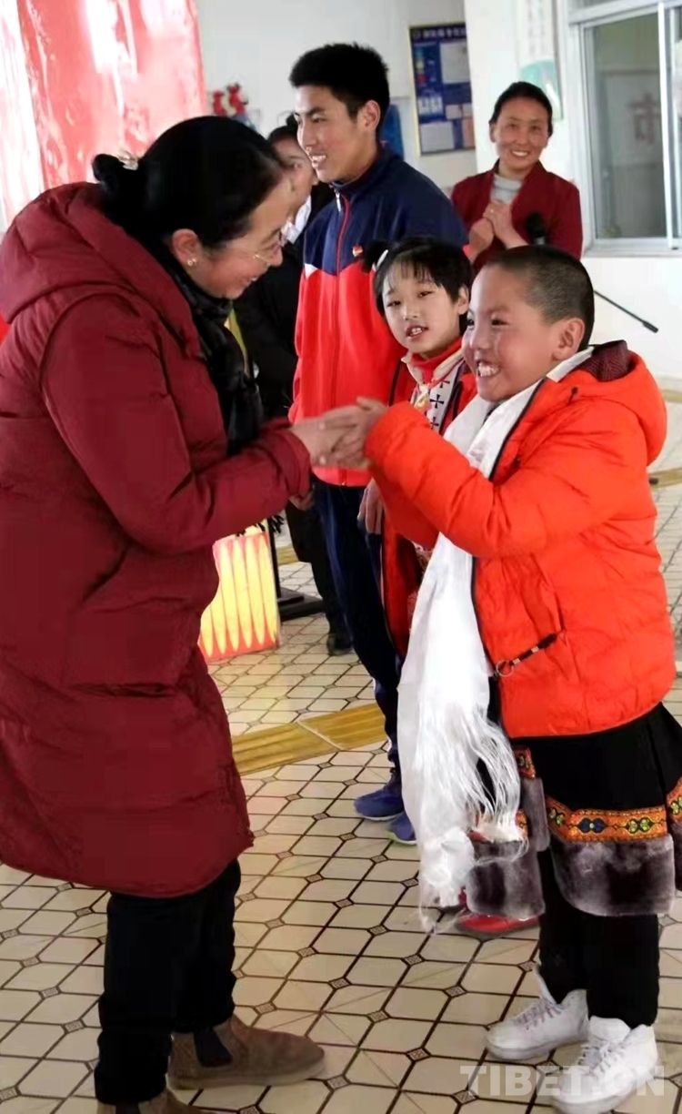 圖為次仁拉姆為那曲市特殊教育學(xué)校學(xué)生獻(xiàn)哈達(dá),半蹲著跟學(xué)生握手,場面非常溫暖