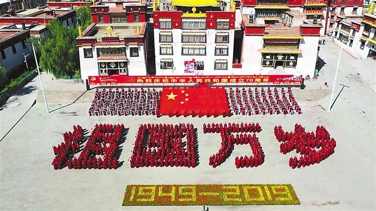 引導(dǎo)宗教界人士爭(zhēng)做愛(ài)黨愛(ài)國(guó)愛(ài)人民、堅(jiān)決維護(hù)祖國(guó)統(tǒng)一和民族團(tuán)結(jié)的模范。圖為2019年10月1日,西藏自治區(qū)昌都強(qiáng)巴林寺僧人以自己的方式表達(dá)對(duì)中華人民共和國(guó)成立70周年的祝福。