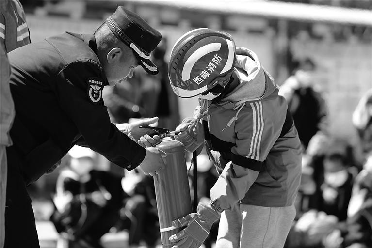 圖為消防知識進校園活動中,消防員手把手教學生學習使用滅火器。(圖片由山南市消防救援支隊提供)
