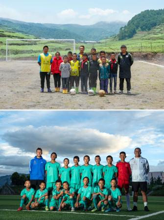 上圖:2019年5月29日,在瓦吾小學(xué)的泥地足球場(chǎng)上,該校足球隊(duì)創(chuàng)建人曲比史古(左一)、來自長(zhǎng)春的支教老師崔洪明(右一)和足球隊(duì)球員合影。下圖:2020年8月13日,在四川省昭覺縣拉莫足球場(chǎng),歐足聯(lián)A級(jí)教練哈維爾(后排左一)、搭檔殷建淋(后排右一)與昭覺皇家馬德里足球隊(duì)球員合影,該球隊(duì)有7名來自瓦吾小學(xué)的孩子。新華社記者沈伯韓攝