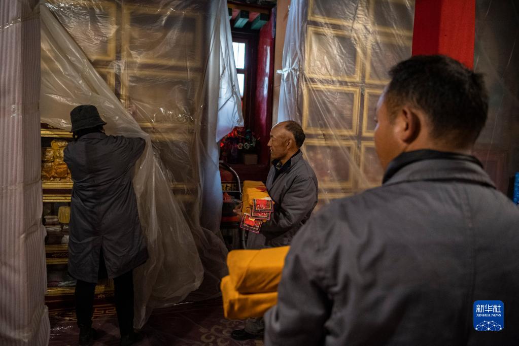 久米次成(左一)在布達(dá)拉宮整理館藏貝葉經(jīng)(2008年5月12日攝)。新華社發(fā)