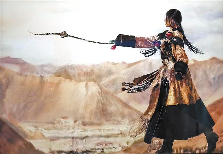 中國畫作品《幸福西藏》運用工筆重彩的繪畫藝術(shù)表現(xiàn)形式,描繪了布達拉宮廣場上民族和睦的美好生活圖景。畫面中,湛藍天空下,藏族群眾與遠道而來的各地游客們相聚雪域高原,燦爛的笑容映照出新時代西藏人民的美好生活,也反映出西藏自然風光、人文風情對各地游客的極大吸引力。從青年旅行者們或騎著單車,或舉起相機認真拍照的表情,能深刻感受到他們對美麗西藏的向往。同時,繪畫作品反映出近年來西藏旅游事業(yè)的蓬勃發(fā)展以及各族兒女團結(jié)互助、攜手進步的新時代美好生活景象。水彩·粉畫《颯·薩》運用人物特寫的藝術(shù)創(chuàng)作手法,展現(xiàn)出一位西藏姑娘甩出烏爾朵的颯爽姿態(tài);油畫《藏歷新年薩迦禳祈?!芬悦骺鞜崃业纳屎嫱谐霎?shù)孛癖娺M行藏歷新年祈?;顒拥臍g樂場景;油畫《中國玉麥》以紀實敘事的創(chuàng)作方式,描繪了隆子縣玉麥鄉(xiāng)卓嘎、央宗姐妹放牧守邊的故事,畫面中她們專注地懸掛國旗的樸實舉動,傳遞出高原姊妹對祖國的深愛之情。