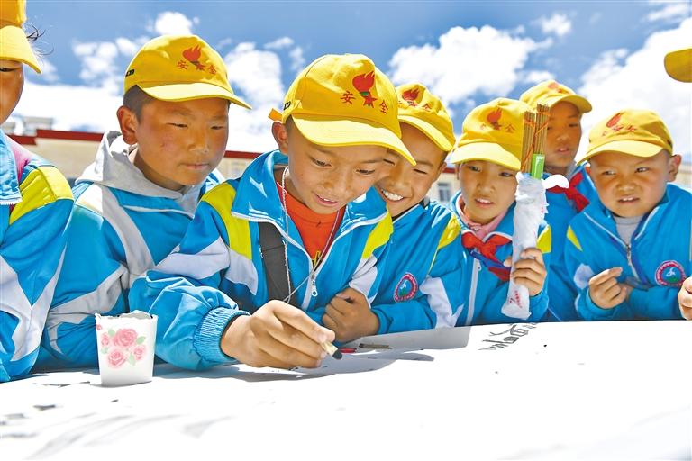 林周縣江蘇小學(xué)的學(xué)生在體驗(yàn)藏文書(shū)法的魅力。記者 李洲 攝