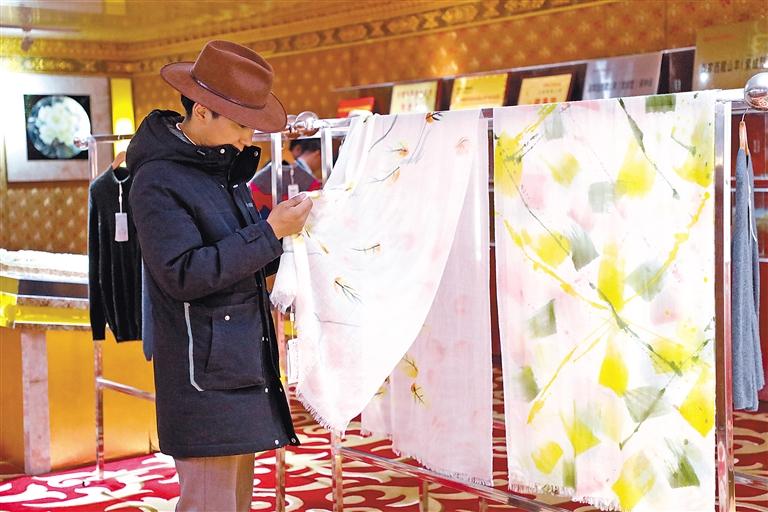 圖為消費者在措勤縣絨山羊良種擴繁養(yǎng)殖場展覽廳挑選“金紫絨”羊絨制品。記者 永青 攝