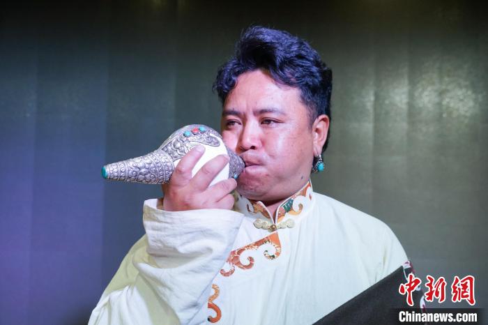圖為樂(lè)團(tuán)成員吹奏吉祥海螺。馬銘言 攝