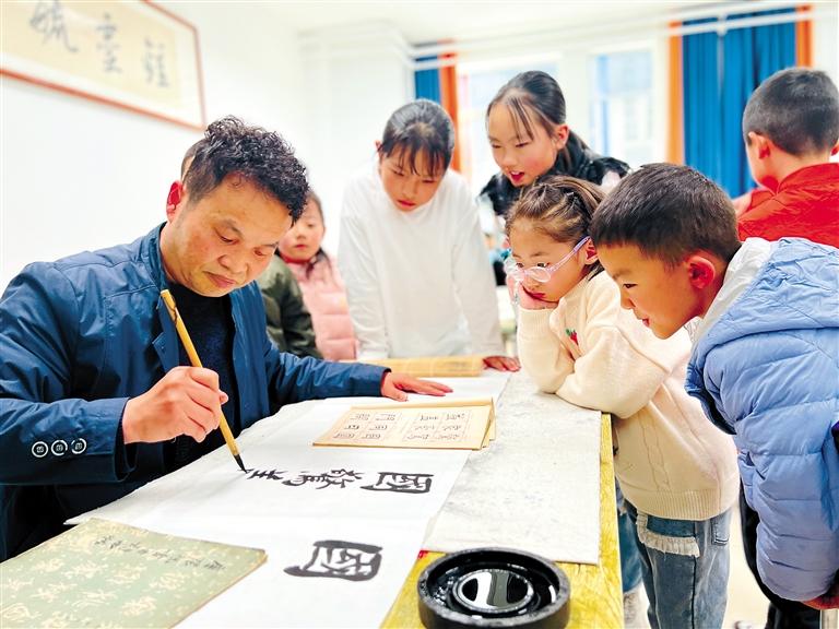 圖為少年宮老師為學(xué)員上書法課。