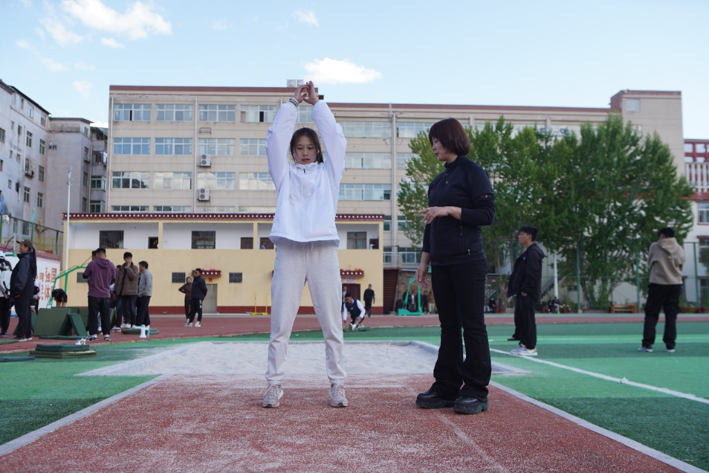 馬曉衛(wèi)正在指導(dǎo)昌都市第一高級中學(xué)的學(xué)生立定跳遠(yuǎn)。新華社記者 邵澤東 攝