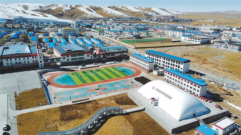 一場冬雪初晴,聶榮草原的空氣中彌漫著清新的氣息。嶄新的塑膠操場上,活躍著孩子們青春的身影。四周的教學(xué)樓、宿舍樓、多功能教室、氣膜球館等現(xiàn)代化建筑參差錯落,儼然是這座高海拔縣城的新地標,映射著草原教育發(fā)展的鏗鏘步伐。