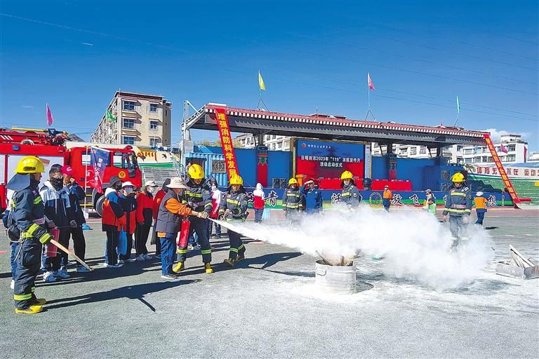 11月5日,2023年日喀則市“119”消防宣傳月活動啟動儀式在日喀則市第三高級中學(xué)舉行。日喀則市消防安全委員會成員單位及師生代表共1500余人參加活動?;顒又?,消防技能挑戰(zhàn)、消防科普互動、消防裝備展覽、改革轉(zhuǎn)隸五周年成果展、消防技能展示等,吸引了大批師生近距離體驗消防、認識消防,進一步筑牢校園消防安全“防火墻”。