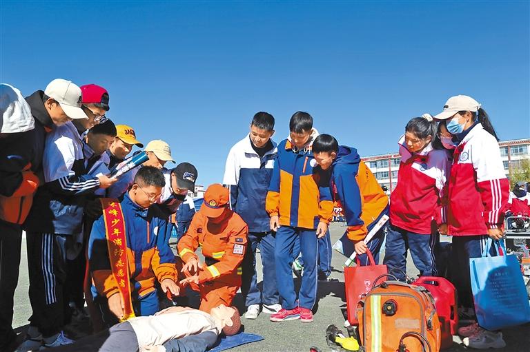 圖為消防員向同學(xué)們傳授急救知識。洛桑頓珠 記者 盧文靜 攝