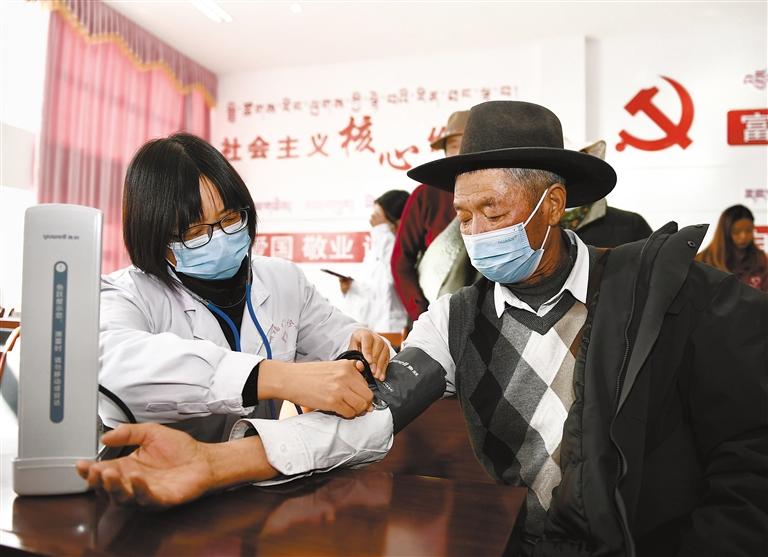 圖為拉薩市青年志愿救援隊(duì)的醫(yī)護(hù)人員為群眾測(cè)量血壓。記者 旦增蘭澤 攝