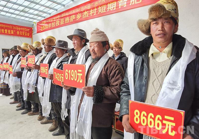 資料圖:圖為西藏日喀則市拉孜縣熱薩鄉(xiāng)杰村參與短期育肥農(nóng)民專(zhuān)業(yè)合作社的村民們領(lǐng)到了分紅款