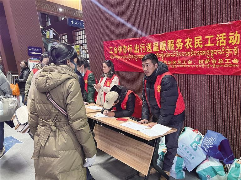 1月31日,西藏自治區(qū)總工會與拉薩市總工會聯(lián)合柳梧新區(qū)公安局應急處突大隊、中國青藏鐵路集團有限公司,在拉薩火車站內為返鄉(xiāng)農(nóng)民工發(fā)放1000份“工會愛心大禮包”,并提供乘車咨詢、便民服務、維持秩序等服務,將工會組織的溫暖送到農(nóng)民工心坎上。