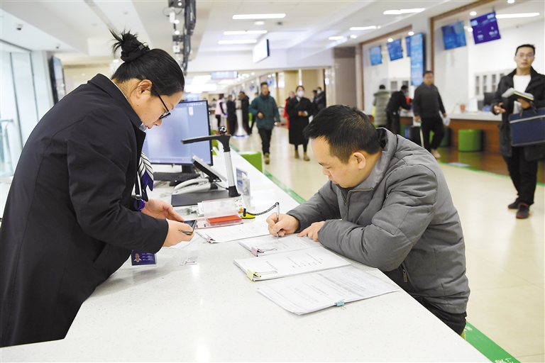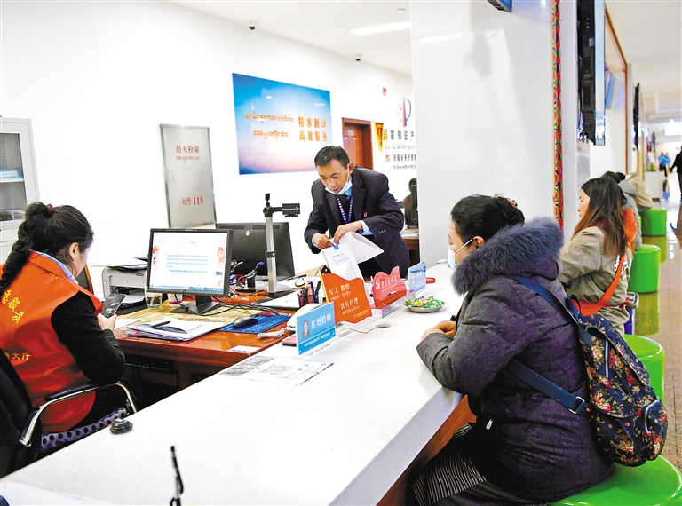 拉薩三級政務(wù)服務(wù)大廳窗口工作人員為市民群眾辦理相關(guān)業(yè)務(wù)。