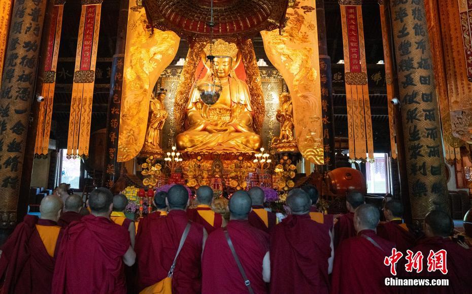 5月16日至18日,西藏少年活佛參學團赴浙江參觀學習,感受江南水鄉(xiāng)綿延的歷史人文底蘊。圖為5月16日,西藏少年活佛參學團在普陀山普濟禪寺誦經禮佛。
