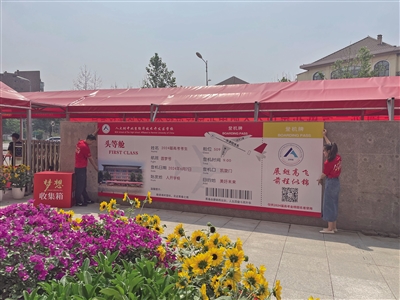 “2024高考加油”“高考就是高高興興地考試”“保持靜心,增強信心,做題專心,考試細心”……考生一進考點,就可以看到這些鼓舞人心的標語。走出考點時,一張巨型“圓夢號”頭等艙登機牌映入學生眼簾,祝??忌鷤冋钩岣唢w,前程似錦。