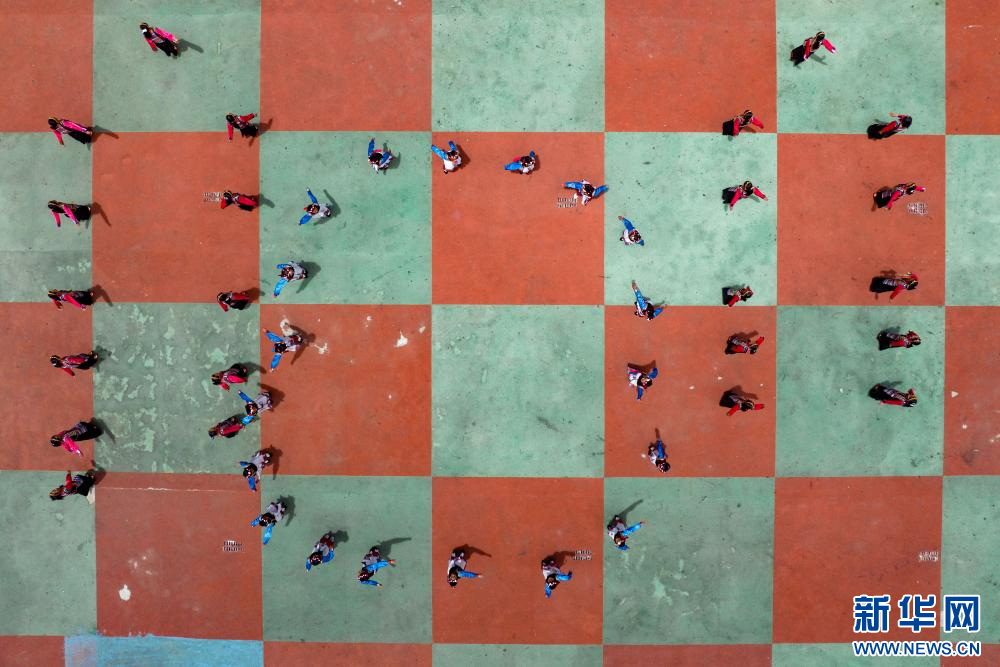6月21日,乃東區(qū)亞堆鄉(xiāng)小學(xué)的學(xué)生在表演節(jié)目(無(wú)人機(jī)照片)。新華網(wǎng) 旦增努布 攝