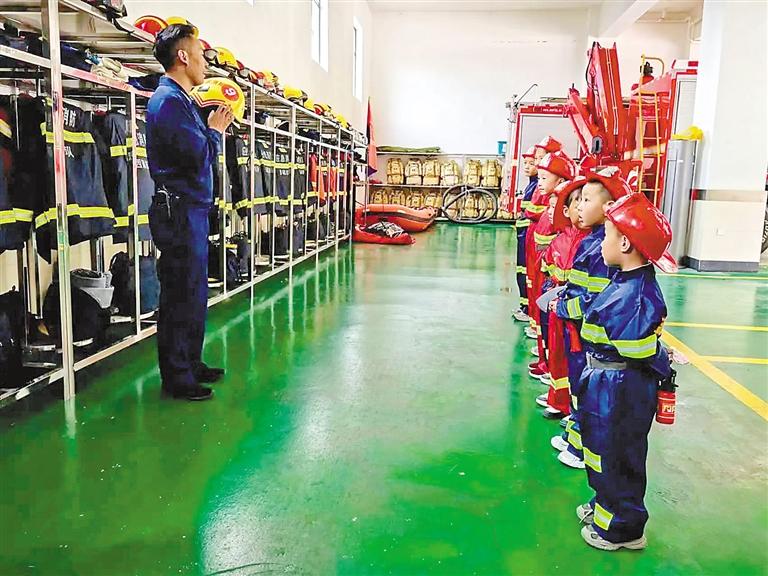 活動(dòng)中,消防員為孩子們講解防火安全常識(shí)。