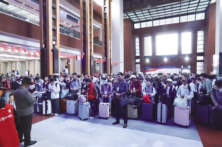 拉薩火車(chē)站工作人員組織學(xué)生團(tuán)體準(zhǔn)備進(jìn)站。圖由孫皓提供