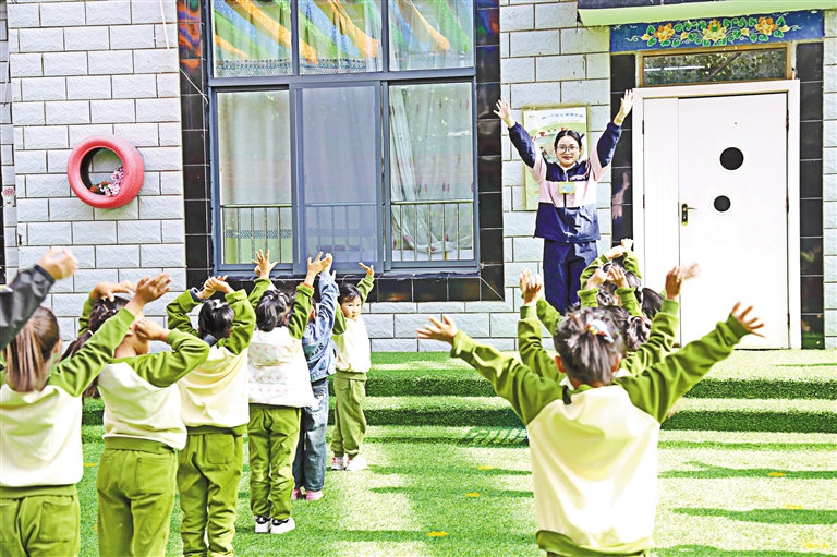 圖為楊攀帶領小朋友們做課間操。記者 潘璐 攝