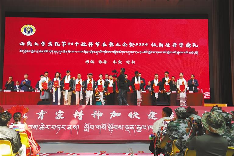 10日下午,西藏大學(xué)在納金校區(qū)雙創(chuàng)活動中心舉辦第40個教師節(jié)表彰大會暨2024級新生開學(xué)典禮?;顒釉跓崆闅g快的暖場歌舞中拉開帷幕,會場內(nèi)紅旗飄揚(yáng),氣氛熱烈而莊重,全體2024級新生、學(xué)校各單位主要負(fù)責(zé)人、受表彰師生代表等共計3300余師生齊聚一堂,共同見證這一重要時刻。