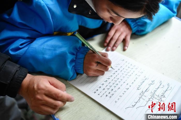 10月25日,在西藏自治區(qū)那曲市聶榮縣中學(xué),學(xué)生在老師的帶領(lǐng)下學(xué)習(xí)藏文書法。中新社記者 貢嘎來松 攝