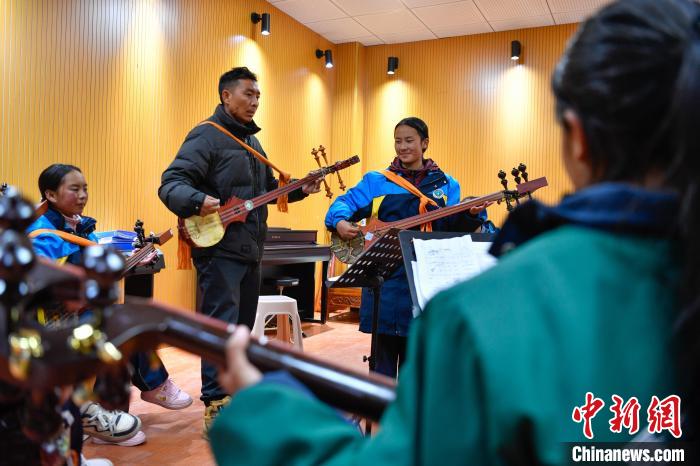 10月25日,在西藏自治區(qū)那曲市聶榮縣中學(xué),學(xué)生在老師的帶領(lǐng)下學(xué)習(xí)扎念琴。中新社記者 貢嘎來松 攝