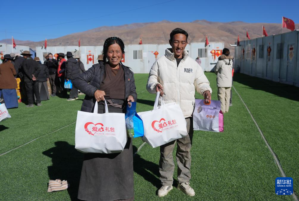 1月27日,拉孜縣加嘎村安置點受災(zāi)群眾領(lǐng)到新年大禮包。新華社記者 晉美多吉 攝