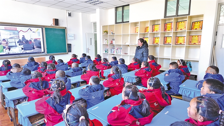 隨后,在定日縣委黨校禮堂里,北京市八一學(xué)校和成都市錦江區(qū)嘉祥外國語學(xué)校的視頻畫面切入大屏幕,長所鄉(xiāng)小學(xué)學(xué)生代表和他們一起隨著歌曲節(jié)奏,聲音嘹亮地唱著:“穿過風(fēng)和雨,我想要把未來點亮……”稚嫩的童聲與千里之外的同齡人同頻共振,一首《把未來點亮》響徹云霄。“定日縣地震剛發(fā)生,北京市八一學(xué)校和四川省成都市錦江區(qū)嘉祥外國語學(xué)校第一時間給災(zāi)區(qū)的學(xué)生捐款捐物,北京市八一學(xué)校學(xué)生給大家畫了畫、寄了賀卡,還錄制了一首叫《讓世界充滿愛》的歌曲來鼓勵震區(qū)的孩子們。所以這次‘開學(xué)第一課’,選擇了這首《把未來點亮》來視頻連線合唱?!蔽鞑刈灾螀^(qū)教育廳思政處副處長韓利君介紹說。