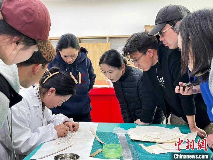 4月22日,西藏大學圖書館特藏部老師德吉曲珍為學生上古籍修復課程,所使用的為仿真古籍。中新社記者 趙朗 攝