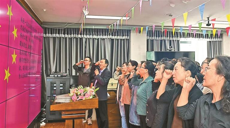 圖為拉薩市師范學(xué)校附屬小學(xué)的教師們?cè)诮處煿?jié)這天莊嚴(yán)宣誓,堅(jiān)守教育初心。胡舟 記者 次仁平措 攝