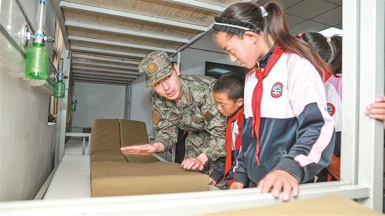 屏幕那頭,孩子們好奇地提問:“叔叔,你們那里冷嗎?”“你們那里會(huì)有高原反應(yīng)嗎?”官兵們耐心解答,還特意展示了高原防寒裝具和制氧設(shè)備。