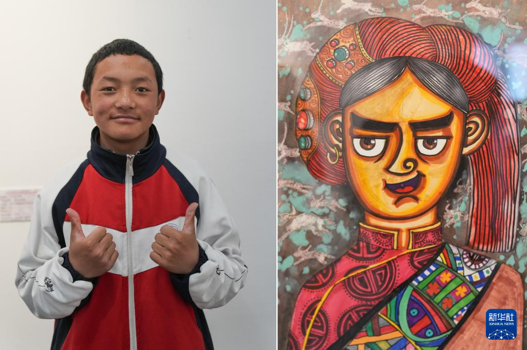 4月19日拍攝的拉薩市特殊教育學(xué)校15歲的聽障學(xué)生多杰占堆和他的作品《哥的頭像》(拼版照片)。新華社記者 晉美多吉 攝