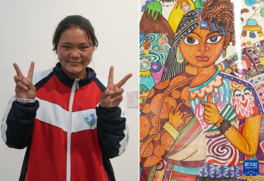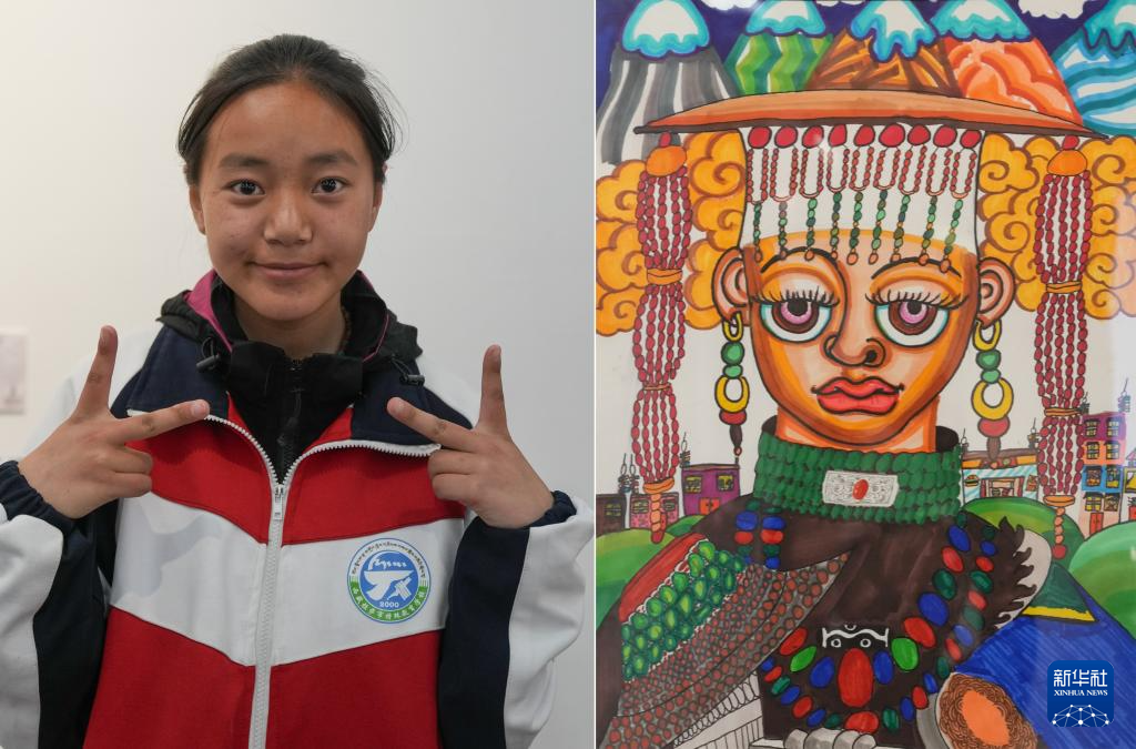 4月19日拍攝的拉薩市特殊教育學(xué)校14歲的聽障學(xué)生貢覺央吉和她的作品《阿里服飾》(拼版照片)。新華社記者 晉美多吉 攝