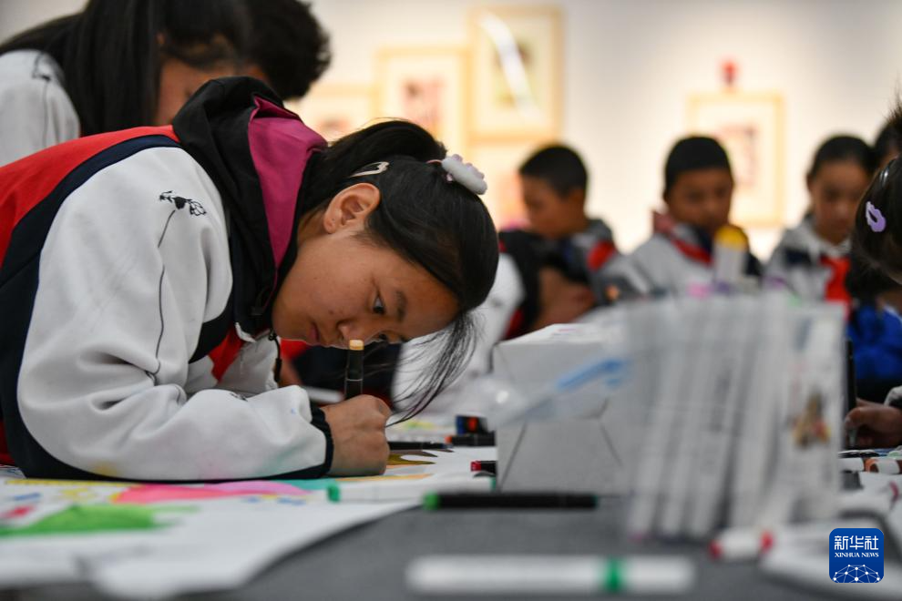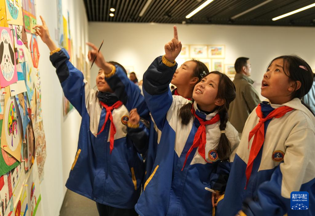 4月19日,拉薩市的小學(xué)生在參觀畫展。新華社記者 晉美多吉 攝