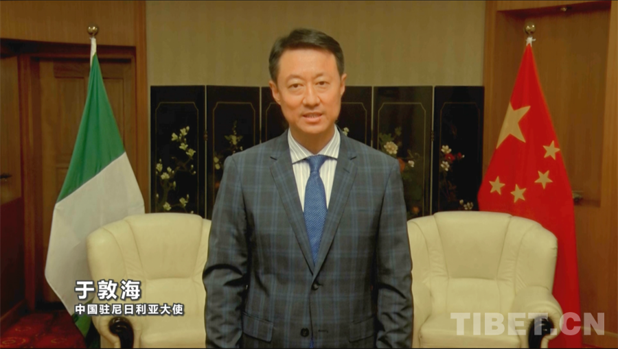 圖為中國(guó)駐尼日利亞大使于敦海通過VCR致辭