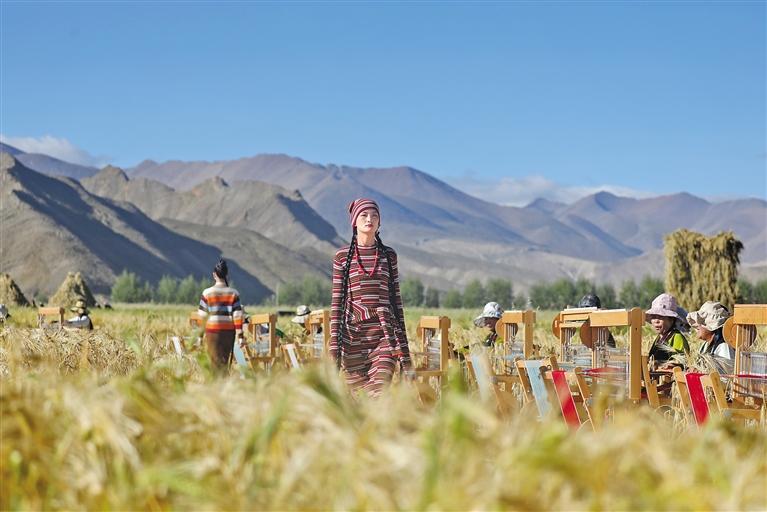 在望果節(jié)的傳統(tǒng)儀式下,伴隨著編織聲與鋼琴聲協(xié)奏的交響曲,9月8日,以“雪域·交響”為主題的Sandriver2024秋冬江孜氆氌時尚秀在江孜縣江熱鄉(xiāng)班久倫布村舉行,展現(xiàn)巧手編織下的智慧結晶,呈現(xiàn)一場絕美的服飾走秀盛宴。