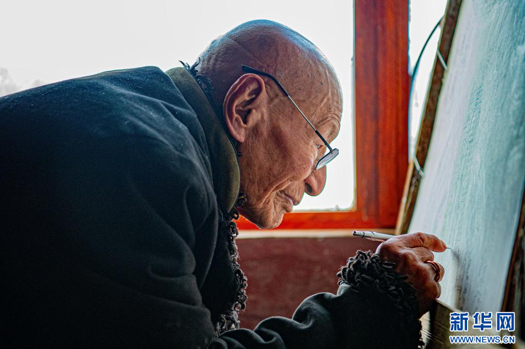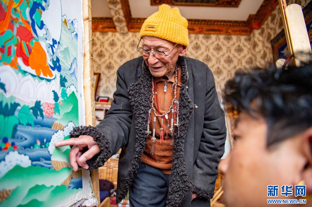 10月17日,今年92歲的昌都嘎瑪嘎赤畫(huà)派國(guó)家級(jí)非遺傳承人嘎瑪?shù)吕赵诩耶?huà)唐卡。新華網(wǎng) 旦增努布 攝