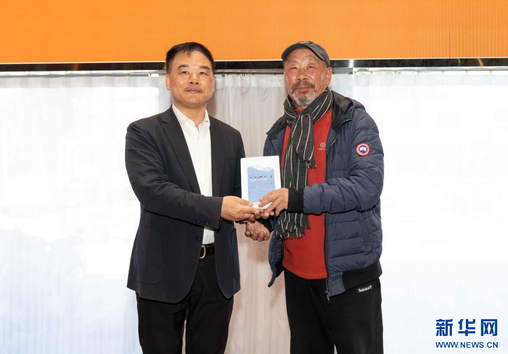 作者余風(fēng)(左)向蒞臨的嘉賓贈(zèng)書留念(11月9日)。新華社記者 旦增尼瑪曲珠 攝