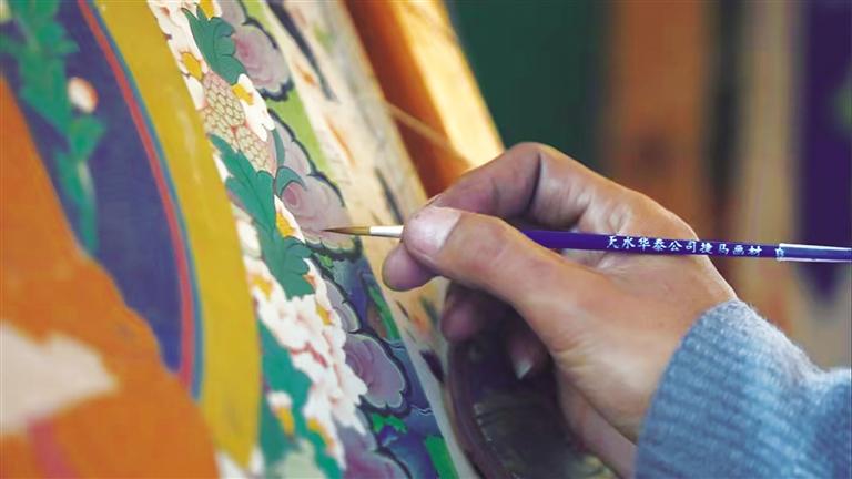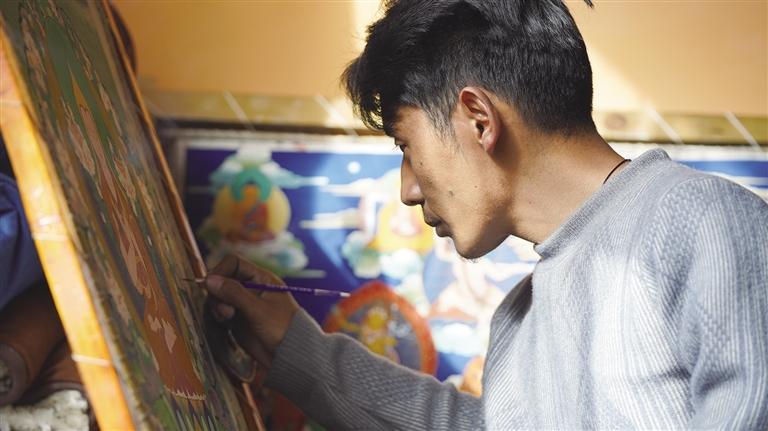 屋內(nèi),是他伏案繪制唐卡的專注身影;身旁,是父母欣慰的目光與陪伴?!白詮膶W(xué)會了唐卡繪畫后,我一直在拉薩就業(yè)謀生,但由于家里有年邁的父母需要照顧,我就回到家里一邊照顧父母,一邊繪畫定制的唐卡。這樣不僅有穩(wěn)定的收入,還能像其他人一樣靠自己的雙手過上幸福的生活?!蹦岈敶稳始拥馗嬖V記者,他的話語中充滿了對生活的感恩和對未來的信心。