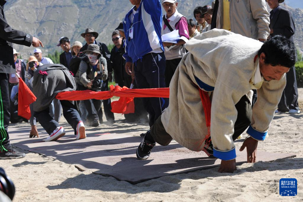 2011年8月30日,兩位來自拉薩農(nóng)牧區(qū)的群眾在雪頓節(jié)上進(jìn)行押加比賽。新華社記者 文濤 攝