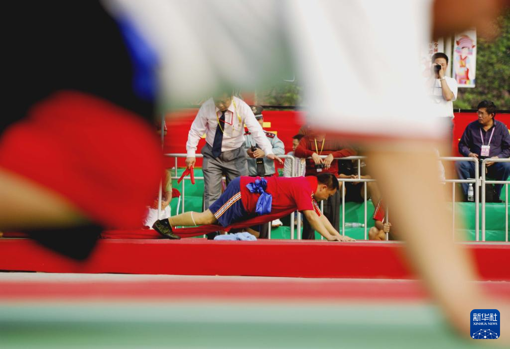 11月27日,貴州隊選手張仁信在55公斤級決賽中。他戰(zhàn)勝重慶隊選手王珍寬,獲得一等獎。當(dāng)日,第十二屆全國少數(shù)民族傳統(tǒng)體育運動會押加項目55、61、68、76、85公斤級五個組別的決賽在海南省三亞市舉行。新華社記者 周牧 攝