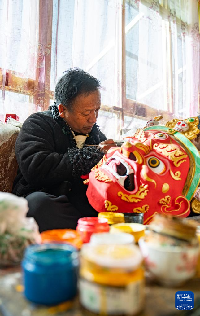 12月9日,西洛在合作社制作西藏傳統(tǒng)面具。新華社記者 丁增尼達 攝 ??