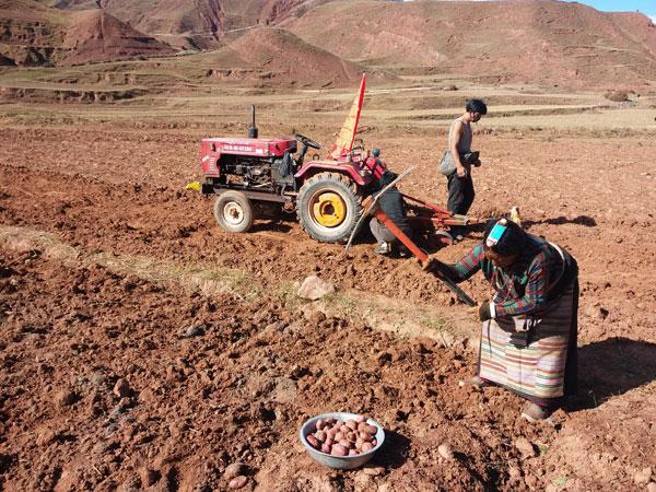在充分調(diào)研的基礎(chǔ)上,嘎瑪澤加從本村實際出發(fā),積極爭取項目、資金支持,于2014年起牽頭在全村推廣紅土豆和藍(lán)青稞特色產(chǎn)業(yè)種植工作。經(jīng)過不斷努力,成功將覺恩村紅土豆種植面積擴大到1200畝、藍(lán)青稞1000畝,這兩項種植業(yè)每年為群眾創(chuàng)收430萬元,使群眾看到了發(fā)展特色種植產(chǎn)業(yè)帶來的實實在在的經(jīng)濟效益。