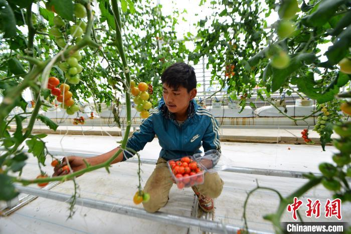 圖為2019年9月,拉薩一高效溫室大棚內(nèi),當(dāng)?shù)啬贻p的農(nóng)牧民采摘小番茄準(zhǔn)備上市銷售。(資料圖) 江飛波 攝