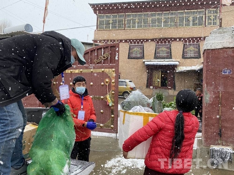 圖為理塘團縣委“青年突擊隊”風(fēng)雪中免費跑腿為抗疫“宅家”群眾送物資上門