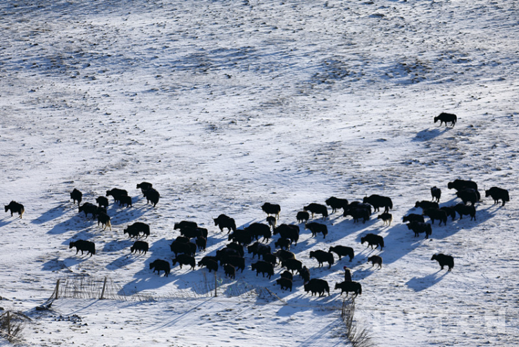 中國西藏網(wǎng)訊 “噓、噓……” 4月27日,在海拔4200多米的四川省甘孜藏族自治州理塘縣奔戈鄉(xiāng)卡灰村牧場上,雪后初霽,牧民洛絨赤乃吆喝著一大群牦牛在雪地覓草。